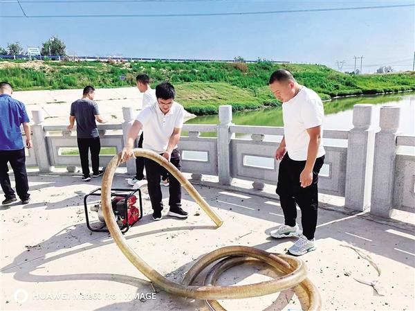 陈州街回族街道组织人员在三连坑附近开展排除道路积水应急演练。