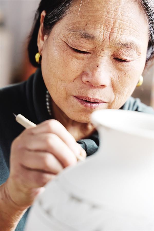 她很快又振作了起来,在儿子刻画的瓶体上,开始剔花。