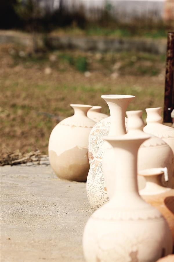胡家陶坊位于这片坦荡如砥的麦田中,走入简陋的作坊,令人目眩神迷。上百件精美的陶器错落摆放,釉面反射出幽光,近看还有细密的开片纹路,瓶体构图丰富,花鸟、人物线条流畅,质朴苍劲,大工不巧,呈现出浅浮雕的立体感。陶耶?瓷耶?我等外行难以分清。