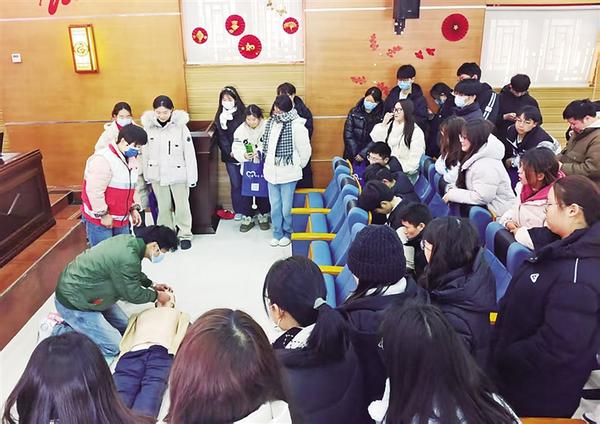 为丰富返乡大学生寒假社会实践内容,普及应急救护知识,2月10日,区红十字会和区团委联合开展返乡大学生应急救护知识培训。图为70余名返乡大学生参加应急救护知识培训。