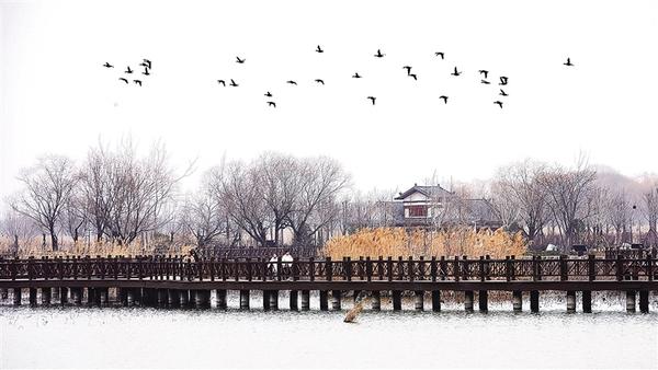 寒湖飞鸟图