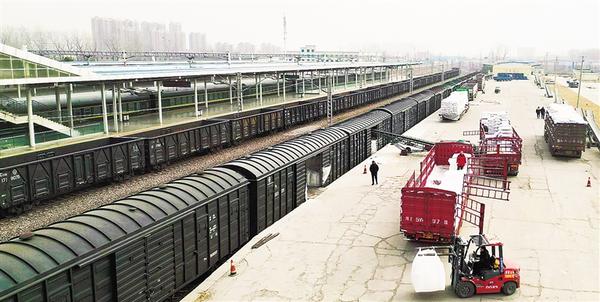 2月22日上午,漯阜铁路周口站货场一片繁忙,满载农资的火车到站卸货,有力保障了我市农业生产的物资需求。 记者 梁照曾 通讯员 耿瑾 摄