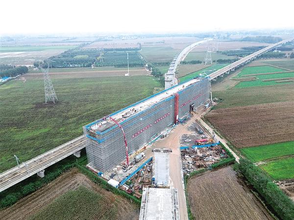 昨日上午9时20分,经过9个小时连续施工,平漯周高铁线第一个跨越现有高铁线路的连续梁——商周特大桥跨郑阜高铁转体梁,顺利完成混凝土浇筑工作。这意味着平漯周高铁站前所有连续梁主体均已建成,为以后铺架桥梁奠定了基础。图为施工现场。 记者 刘俊涛 通讯员 曾庆钿 摄