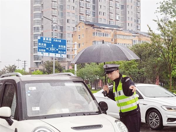民警坚守岗位,保障雨天道路畅通。