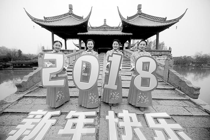 2017年12月28日,在江苏扬州瘦西湖风景区内,导游们手执“2018”字样,迎接2018年的到来。