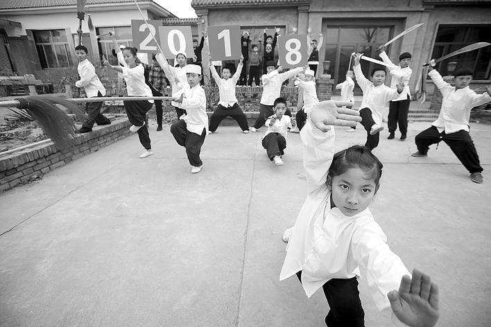 2017年12月31日,在武术之乡河北省沧州市的孟村回族自治县,孩子们练习传统武术八极拳,迎接2018年的到来。