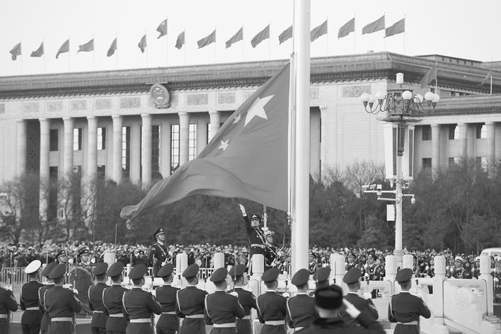 经党中央批准,自2018年1月1日起,由人民解放军担负国旗护卫和礼炮鸣放任务。这是任务调整后,人民解放军仪仗队和军乐团首次执行天安门广场升国旗仪式。新华社发