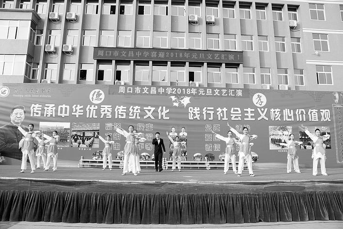 2017年12月31日,周口市文昌中学举行“庆元旦”文艺汇演。当日,该校中心广场人头攒动,到处洋溢着新春的欢乐,文昌师生用独奏、舞蹈、合唱、小品等多种形式表达了对新年的美好希冀。此次汇演,为同学们提供了一个锻炼、展示自我的平台,进一步丰富了校园文化生活。记者 刘华志 摄