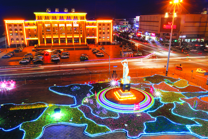 亮起来的不仅是老城区,建设一新的新城区各单位楼体,小区楼体也都亮了起来,各种灯饰随着楼体造型蜿蜒曲折,熠熠生辉。街路两旁的树行道树都换上了“新衣”,树冠自上而下披挂着五颜六色的流星灯饰,梦幻迷离。