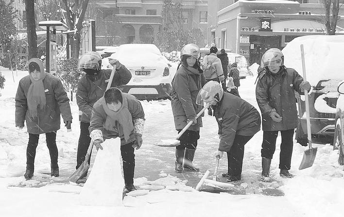 1月3日、4日,周口普降大雪,积雪给市民出行带来困难。为使路面畅通,市民出行方便,周口各部门及干群纷纷走上街头清理积雪。图为某社区工作人员清理路面积雪。②7记者 孙安平 摄