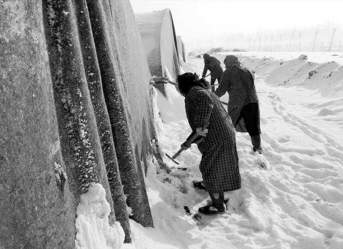 1月3日、4日,我市遭遇大雪天气。由于防范到位,太康县舒兰农场的草莓大棚无一受损。图为太康县舒兰农场工作人员雪后清理大棚上的积雪。②7 记者 孙安平 摄