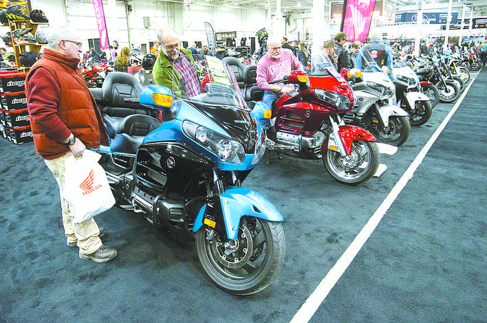 1月5日,在加拿大多伦多,人们在北美国际摩托车展上参观。为期3天的2018年北美国际摩托车展5日在加拿大多伦多开幕,展出了500余家参展商提供的近千辆新车、改装车、二手车及古董车等。新华社发