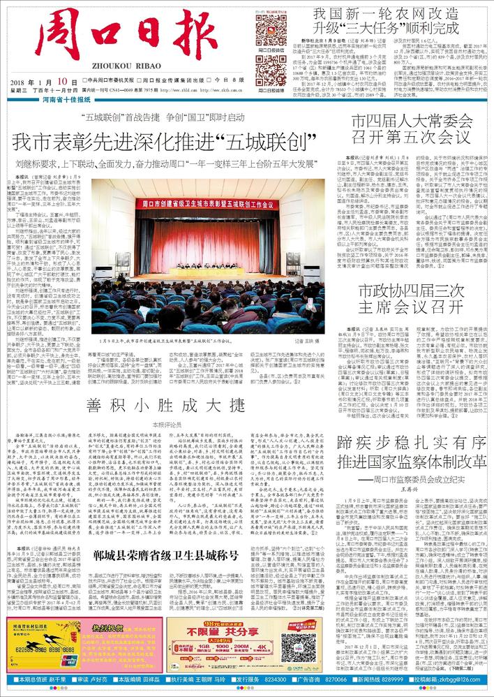 省爱卫会文件显示,经周口市、南阳市爱卫会推荐,按照省级卫生城市、县城、乡镇标准及其考核命名和监督管理办法,省爱卫办组织专家于2017年4月~12月份,对周口市、郸城县等创建省级卫生城市、县城工作进行了资料审核、暗访检查和技术评估,并进行了社会公示。根据评审结果,河南省爱卫会决定,命名周口市为省级卫生城市、郸城县等3个县为省级卫生县城。希望被命名城市、县城、乡镇珍惜荣誉,再接再厉,健全长效管理机制,巩固创建工作成果,全面深入地开展爱国卫生运动,不断改善城乡人居环境,进一步提高人民健康水平,为决胜全面小康、让中原更加出彩做出新的更大贡献。