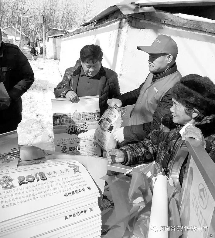 1月8日,陈州高中举行“大走访、广宣传、送温暖”活动,40位教职工来到王店乡高庄、安岭镇张庄、白楼镇小徐庄,走村入户和群众亲切交流,了解他们的生活状况,宣传国家扶贫政策,并送去慰问品。②10