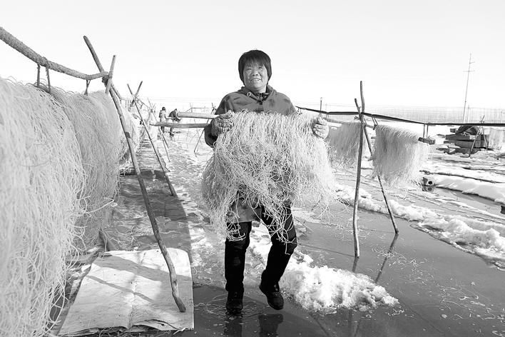 1月10日,商水县袁老乡王屯村农民在晾晒红薯粉条。寒冬时节,该县农民利用传统手工艺加工红薯粉条、粉皮等粉制品,呈现出“冬闲人不闲,个个忙挣钱”的喜人景象,实现冬闲增收。