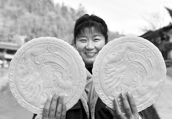 1月11日,在湖北恩施宣恩县万寨乡板场村,一名女孩展示印花糍粑。