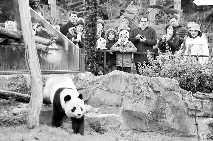 1月13日,在法国圣艾尼昂市博瓦勒野生动物园,游客观看大熊猫宝宝“圆梦”的父亲——大熊猫“圆仔”。当日,首只在法国出生的大熊猫宝宝“圆梦”正式与公众见面。“圆梦”于2017年8月4日生于博瓦勒野生动物园,爸爸妈妈是旅法大熊猫“圆仔”和“欢欢”。新华社发