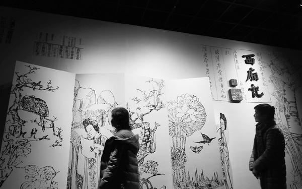 1月19日,观众在欣赏水印版画作品《西厢记》。当日,“水印千年——中国水印版画大展”在位于杭州的浙江美术馆开幕,展览共展出140余件水印版画精品,展现水印版画这一独特技艺的千年艺术成就。新华社发