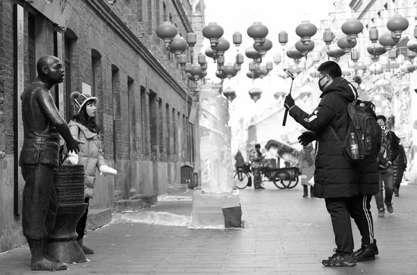 1月19日,游客在哈尔滨中华巴洛克街区拍照留影。近日,冰城哈尔滨市的著名景区——中华巴洛克街区修建完成了多处冰雕,老街添新景,“冰装”迎接八方来客。新华社记者 王建威 摄