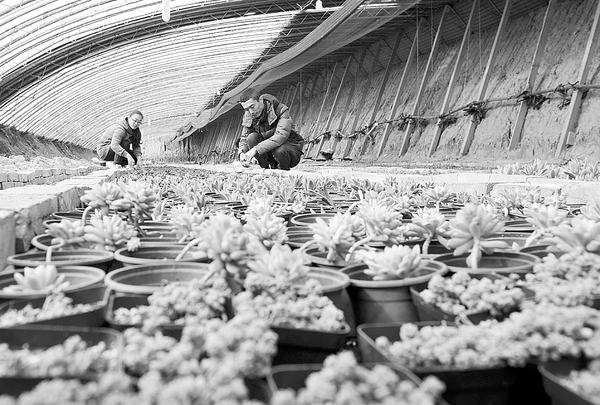 1月21日,田振东(右)、徐梦娇在大棚内打理培育的多肉植物幼苗。2017年初,河北省任丘市的田振东和妻子徐梦娇辞去原有工作,在任丘市丰丽园农业示范园区租下了一个占地1000多平方米的暖棚种植多肉植物,开始了创业之路。经过近1年的发展,如今田振东夫妻的“多肉花园”已初具规模,取得了较好的经济效益。新华社发