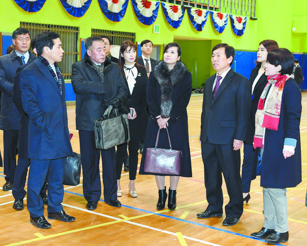 1月21日,朝鲜三池渊管弦乐团团长玄松月(右四)率领的艺术演出考察团在韩国江陵市对演出场地和音响设备进行检查。