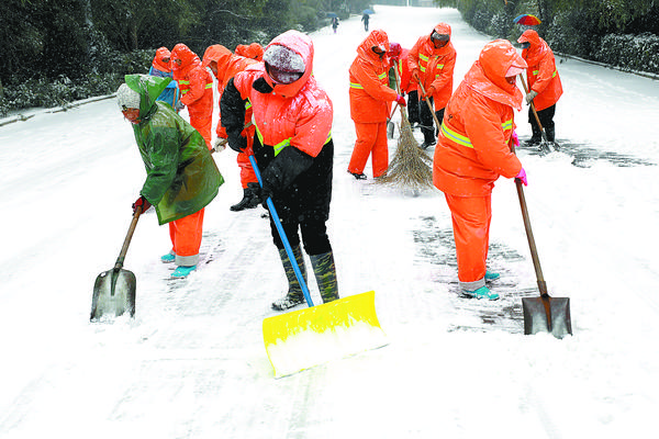 1月25日 ,我国中东部地区出现大范围降雪天气,下雪地区有关部门增派人员执勤巡查、清除冰雪,保障交通畅通。图为环卫工人在清理路面积雪。 周海军 摄