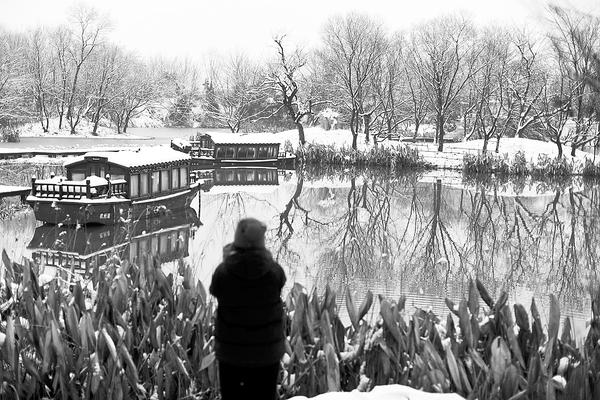 1月28日,游客在杭州西溪湿地拍摄雪景。连日来,浙江省多地迎来降雪。