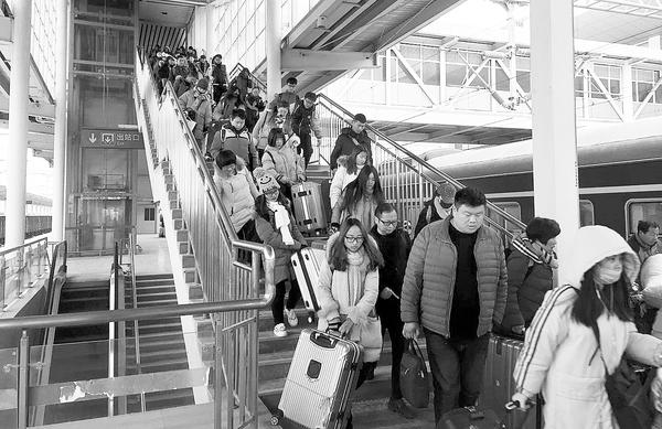周口火车站提前开启春运模式。1月24日以来,周口火车站每天到达和发送的旅客都在6000人左右,是平时客流量的两倍左右。图为即将登车的旅客。②6 记者 牛思光 摄