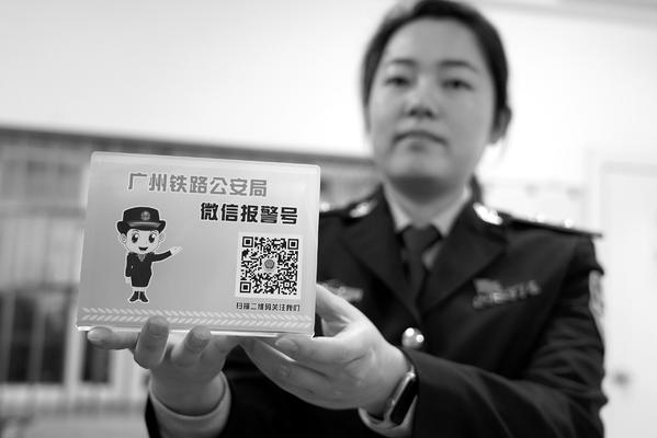 广州:多举措应对铁路客流增长 1月30日,广州铁路公安局民警展示新开通的微信报警平台二维码。旅客可在扫码后向铁路警方实时发送文字、语音、图片、视频等内容,实现快捷报警。春节临近,广州地区铁路客流量稳步上升,广州站和广州南站日发送旅客量已接近27万。同时近期寒冷天气导致部分列车晚点,运输压力增大。当地铁路部门及时组织运能,增开临时服务窗口通道,设立微信报警平台,多举措并行,应对节前客流增长。新华社发