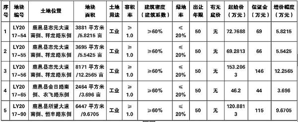 挂牌报价时间为:LY2017-54地块: 2018年2月22日9时至 2018年3月7日14时30分。LY2017-55地块: 2018年2月22日9时至 2018年3月7日14时40分。LY2017-56地块: 2018年2月22日9时至 2018年3月7日14时50分。LY2017-65地块: 2018年2月22日9时至 2018年3月7日15时。LY2017-90地块: 2018年2月22日9时至 2018年3月7日15时10分。挂牌网址:鹿邑县公共资源交易平台(http://www.lyggzyjy.org.cn/)。