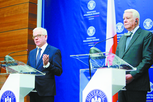 2月1日,在罗马尼亚首都布加勒斯特,波兰外长雅采克·查普托维奇(左)与罗马尼亚外长梅莱什卡努出席新闻发布会。