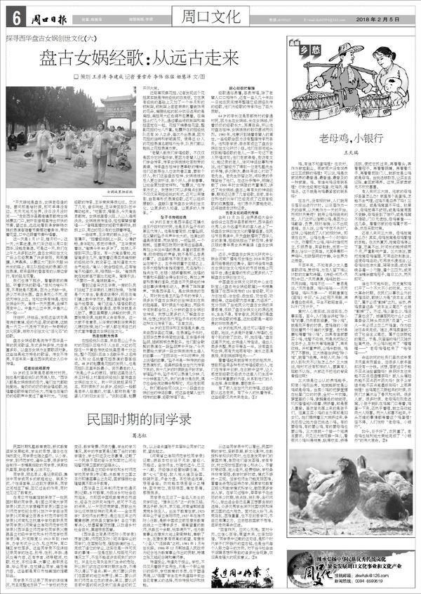 43岁的王言文是西华县红花镇水洼王行政村的村民,他是王氏坠子书的第五代传人。他是抱着简板、拉着坠胡,在父辈的坠子书声中长大的。他演出的道具很简单:两块简板,一把坠胡,一个脚梆。但要用四肢同时使用这些器具,再加上半说半唱的表演、丰富的面部表情、抑扬顿挫的声音,就不是那么容易的事了。这些都难不倒王言文,只见他坐在椅子上,左手持胡置于左腿之上,右手大拇指和食指间握板,无名指和小指夹住弓,右腿小腿绑着脚梆,说唱的节奏和乐器配合得恰到好处,再加上声音和表情的渲染,把盘古开天辟地的神话故事讲得精彩动人,赢得了阵阵掌声。“我是西华县人,是女娲娘娘的后人,同时我也是王氏坠子书的传承人,很多关于盘古女娲的创世神话刻在我的脑海里。有时候去外地演出,两段书中间我都会加上几分钟的盘古女娲创世神话,我想让更多的人了解盘古女娲,也想让我的后代用坠子书的形式把这种文化传承下去。”王言文说。
