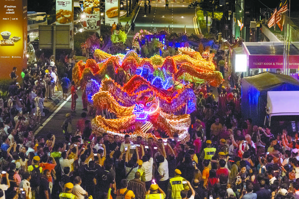 99名舞龙者3日晚在吉隆坡街头舞动一条180米装饰有LED灯的长龙,为即将到来的春节带来浓浓的年味。