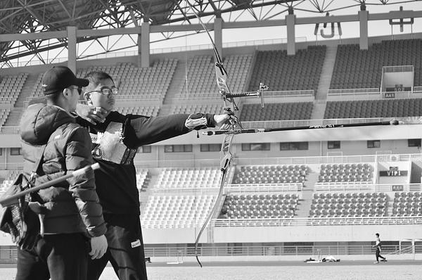 射箭是省运会重要竞技项目。我市射箭项目起步较晚,2016年,市体校组建射箭队,目前,射箭队共有11人。图为市体校教练指导射箭运动员。