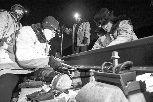 2月5日,在兰新高铁线新疆段红雁池附近,乌鲁木齐高铁线路车间的职工贺小鹏(前左)检查钢轨质量。每天凌晨,乌鲁木齐高铁线路车间的职工在兰新高铁线上进行巡检作业。他们全年往返于所管辖的线路段上,对10余个检修项目按不同周期进行检修,清除钢轨身上的“病害”,保障列车平安出行。新华社发