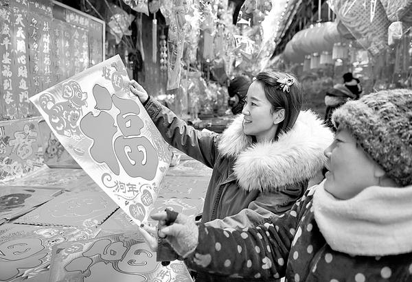 2月5日,市民在唐山市丰润区公园道市场选购“福”字。