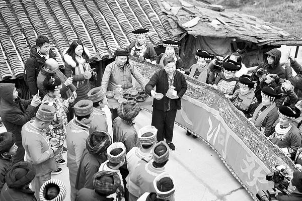2月4日,在湖南省湘西土家族苗族自治州花垣县十八洞村,新郎的迎亲队伍遇上新娘亲友拦门。2月4日,两对分别来自湘西和湘潭的新人特地来到湖南省湘西土家族苗族自治州花垣县十八洞村体验苗族婚礼。新华社发