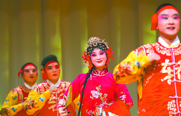 2月4日,在瑞士首都伯尔尼,中国浙江婺剧艺术团的演员表演《抬花轿》选段。