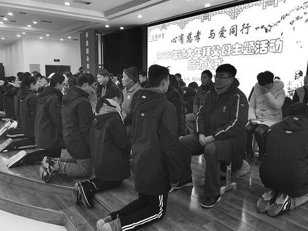“爸妈,您辛苦了。”几十名学生代表跪在父母面前握住他们的手说,父母们感动得热泪盈眶。这是2月5日,周口市文昌中学“过大年拜父母”活动启动仪式上发生的一幕。启动仪式上,周口市文昌中学校长朱贵华代表学校向全体师生、家长发出倡议,号召大家赓续华夏优秀基因,践行孝廉文化。记者 王珂 摄