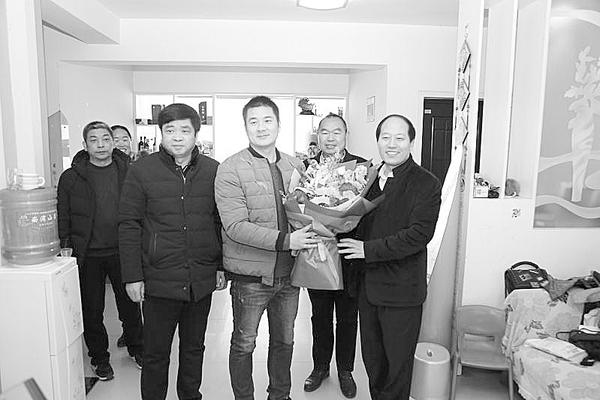 2月6日,市疾控中心职工贾闯在河南省肿瘤医院成功捐献造血干细胞后归来。市疾控中心主任冷冰到贾闯家中看望贾闯,并向他献花。 记者 刘艳霞 摄