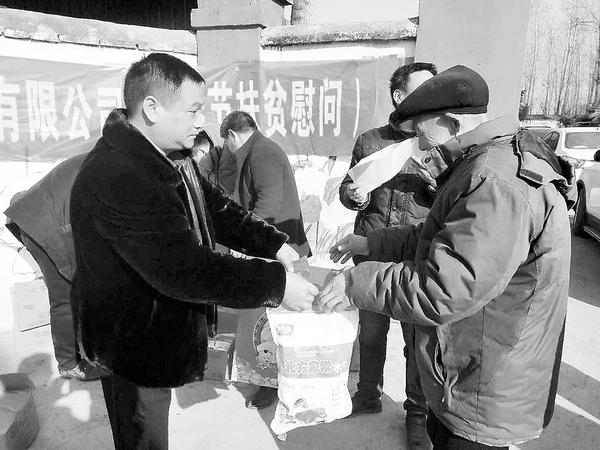2月6日,商水县罗大娘食品有限公司董事长勾富有带领企业员工深入该县部分乡镇和敬老院走访慰问贫困户,将米、油、藕、水饺等送到他们手中。 葛长庚 白杨 摄