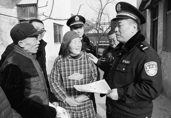 近日,扶沟县公安局韭园派出所民警深入辖区,开展节前矛盾纠纷排查化解,宣传讲解防盗、防骗等安全防范常识,确保辖区群众过一个平安祥和的春节。图为民警正在向辖区群众宣传安全防范常识。(谢永静 李龙喜 摄)
