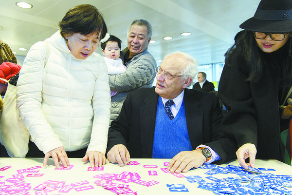 2月10日,在法国巴黎中国文化中心,人们在活动上玩拼字游戏。10日,法国巴黎中国文化中心里张灯结彩,喜庆热闹,洋溢着浓浓的年味,400余名当地民众冒着冬日严寒前来参加“走进中心过大年”活动,共庆新春佳节。 新华社记者 陈益宸 摄