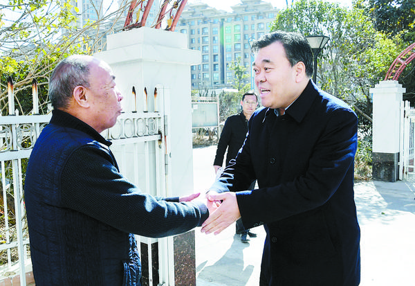王富兴一行首先来到老干部沈伯琤家。一进门,王富兴就握住他的手说:“春节就要到了,我们代表市四大班子来给您拜个早年,祝您新春快乐、阖家幸福!”在询问沈伯琤同志的生活、身体情况后,王富兴关切地嘱咐他保重身体,并诚恳征求他对市委、市政府工作和周口改革发展的意见建议。