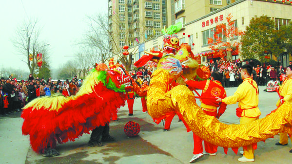 春节期间,沈丘县槐店镇举办民间“草根”艺人踩街“秀”民俗,红红火火过大年舞“巨龙”、耍“文狮子舞”大型文艺演出活动。图为演员们正兴致勃勃表演耍“文狮子舞”、挥舞“巨龙”的热闹场景。 谢辛凌 倪胜章 摄