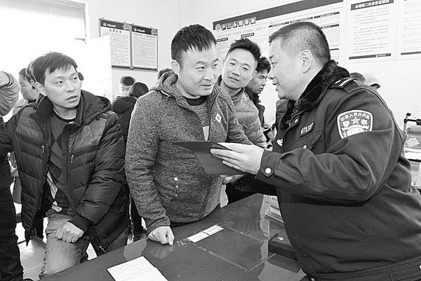 春节期间,扶沟县大批外出务工人员陆续返乡,扶沟县公安局户政部门也迎来了办证高峰。连日来,该公安局户政部门采取增设窗口、延长服务时间、开辟“绿色通道”等措施,全力保障前来办证上户的群众满意而归。图为户籍民警正在热情为群众办理入户手续。 ( 李龙喜摄)