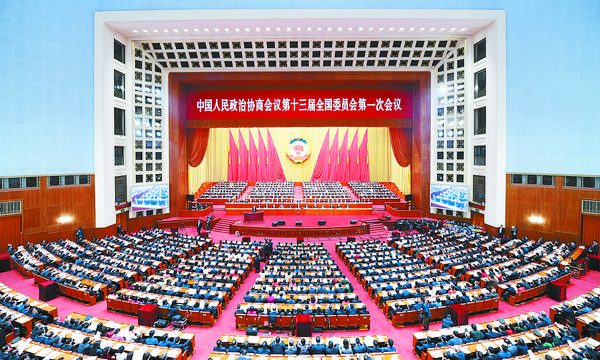 三月北京,春意渐浓。人民大会堂万人大礼堂内穹顶璀璨,气氛庄重热烈。中国人民政治协商会议会徽悬挂在主席台正中,十面鲜艳的红旗分列两侧。