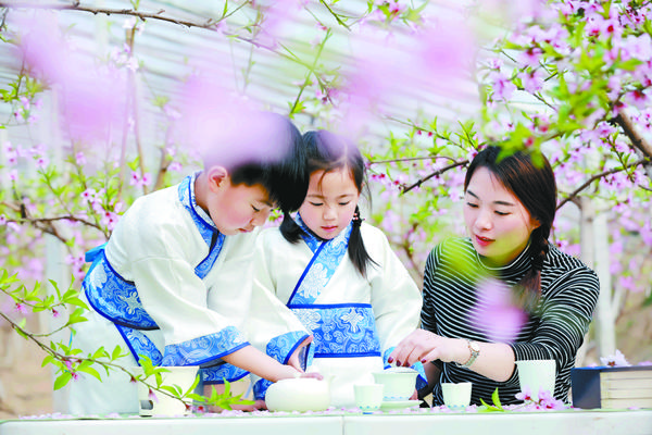 日前,一位年轻的妈妈带着一双儿女在扶沟县韭园镇的一个温室大棚基地学习茶艺。据悉,该基地共有11个桃树温室大棚和200亩露地桃林。在近1个月的花期里,该基地免费向游客开放。前来赏花的游客不但可以在花间弹古筝、拍照,也可以学习茶艺,既欣赏了美景,又陶冶了情操。 谷志方 李永超 摄