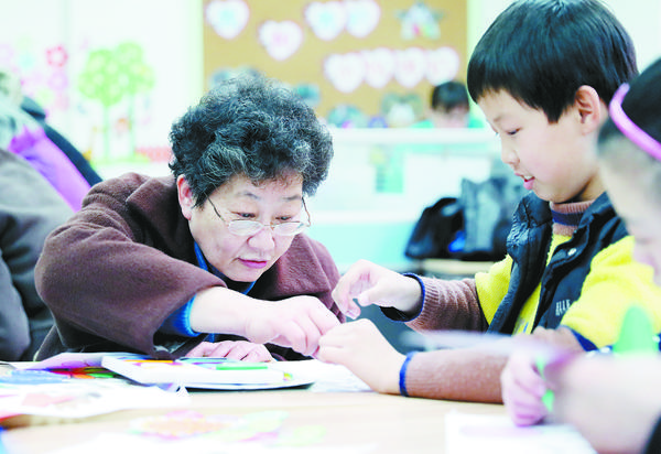 3月7日,在上海华东师范大学附属卢湾辅读实验学校,志愿者奶奶在帮助小朋友完成涂色。