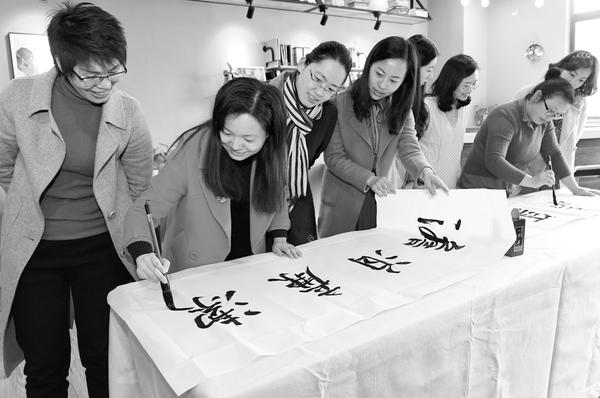 3月6日,福清市纪委女干部在进行书法创作。“三八”国际劳动妇女节来临前,福建省福清市为各界妇女开展读书演讲、书法创作、趣味运动等丰富多彩的文化活动,过一个健康、文明、清廉的节日。新华社记者 张国俊 摄